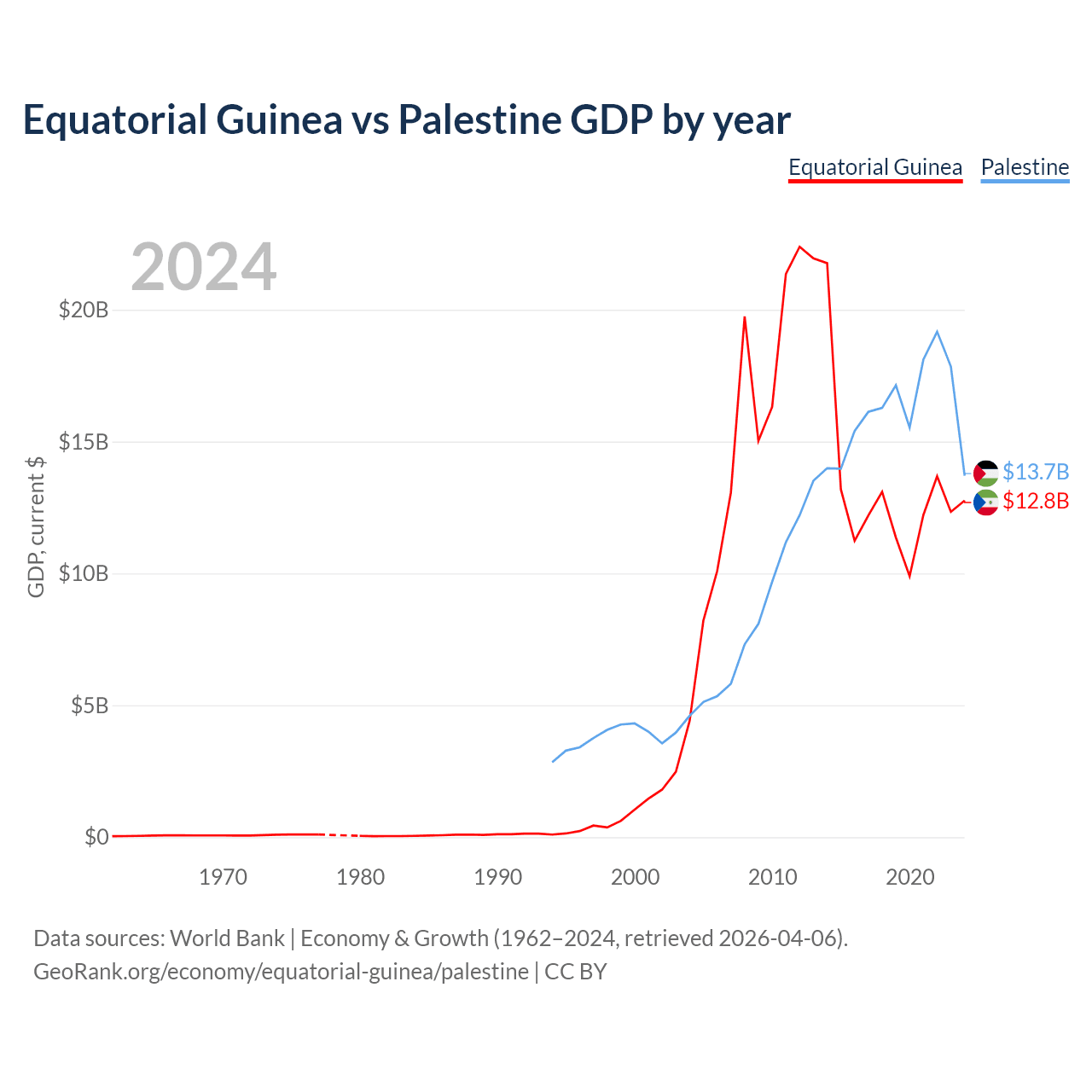 Equatorial Guinea has a GDP of $12.8B compared to $13.7B for Palestine, ranking 148/197 and 146/197 by economy size, respectively.