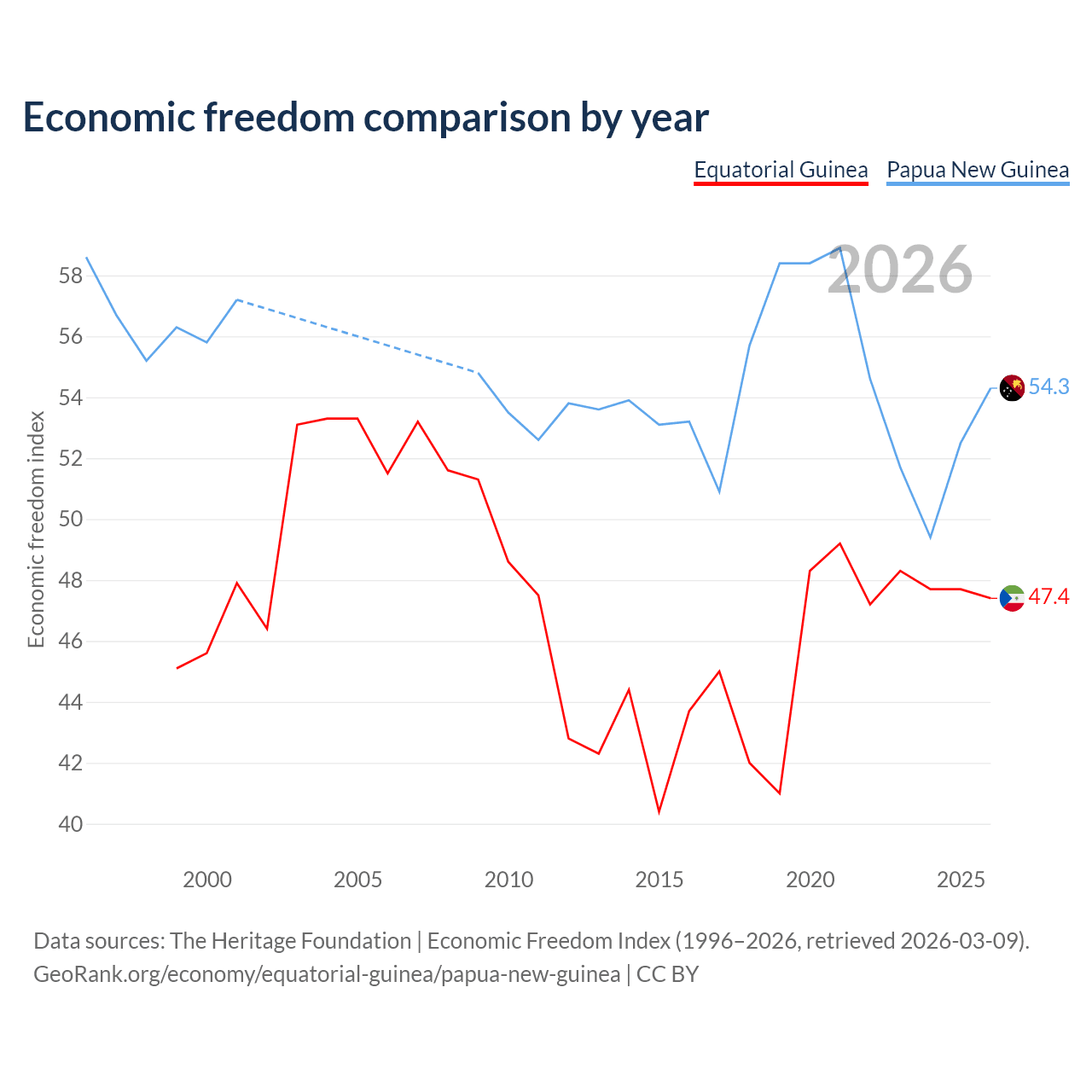 The Economic Freedom Index for Equatorial Guinea is 47.4, ranking 175/197, compared to 54.3 for Papua New Guinea, ranking 134/197. The chart above displays a comparison of annual changes in economic freedom indexes.
