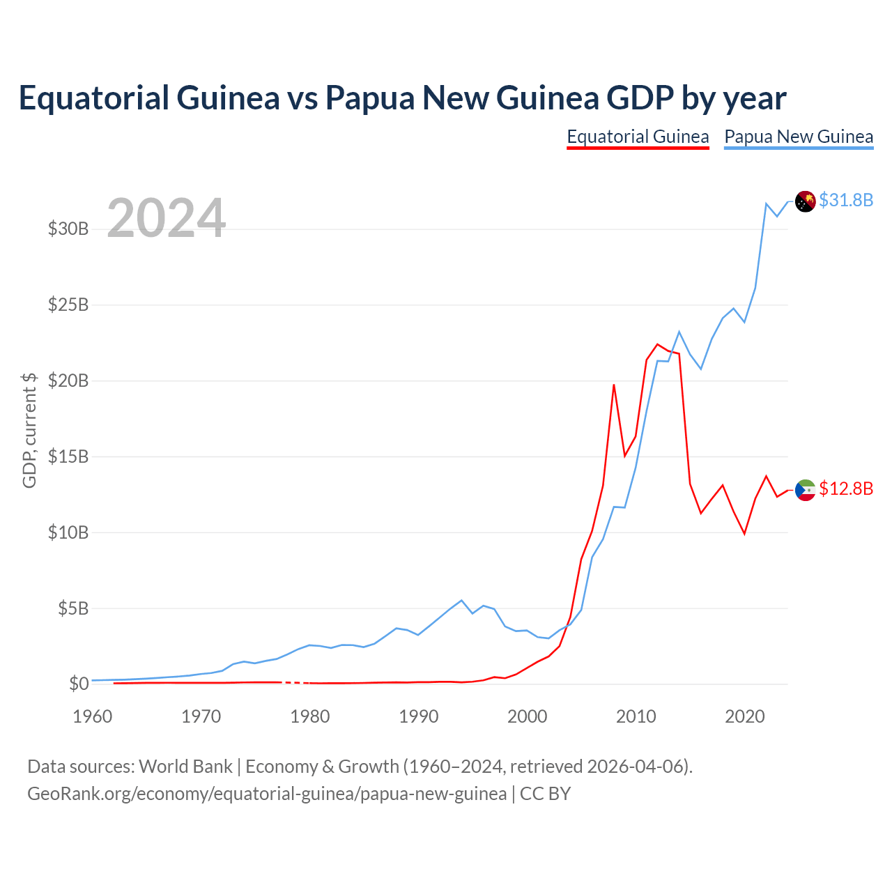 Equatorial Guinea has a GDP of $12.8B compared to $31.8B for Papua New Guinea, ranking 148/197 and 110/197 by economy size, respectively.
