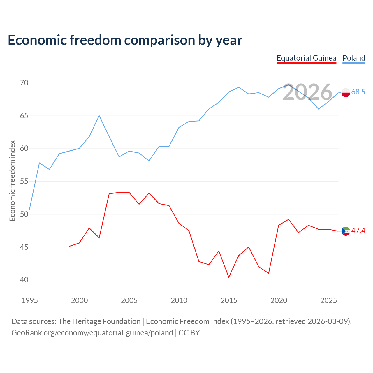 The Economic Freedom Index for Equatorial Guinea is 47.4, ranking 175/197, compared to 68.5 for Poland, ranking 46/197. The chart above displays a comparison of annual changes in economic freedom indexes.