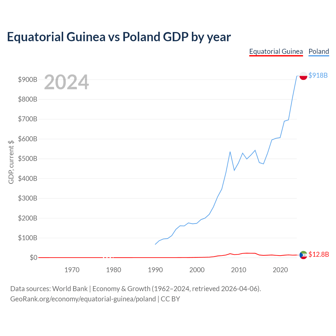 Equatorial Guinea has a GDP of $12.8B compared to $918B for Poland, ranking 148/197 and 21/197 by economy size, respectively.