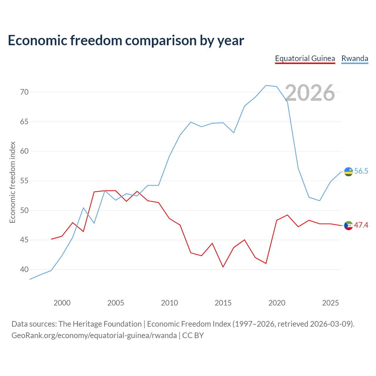 The Economic Freedom Index for Equatorial Guinea is 47.4, ranking 175/197, compared to 56.5 for Rwanda, ranking 121/197. The chart above displays a comparison of annual changes in economic freedom indexes.