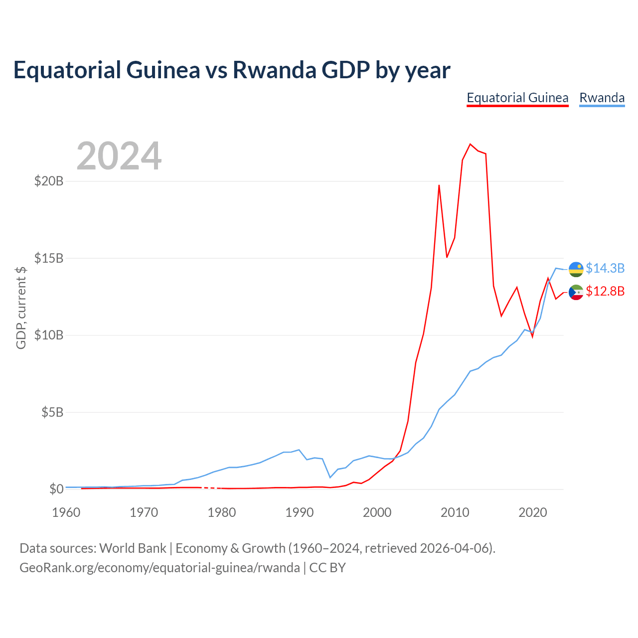Equatorial Guinea has a GDP of $12.8B compared to $14.3B for Rwanda, ranking 148/197 and 144/197 by economy size, respectively.