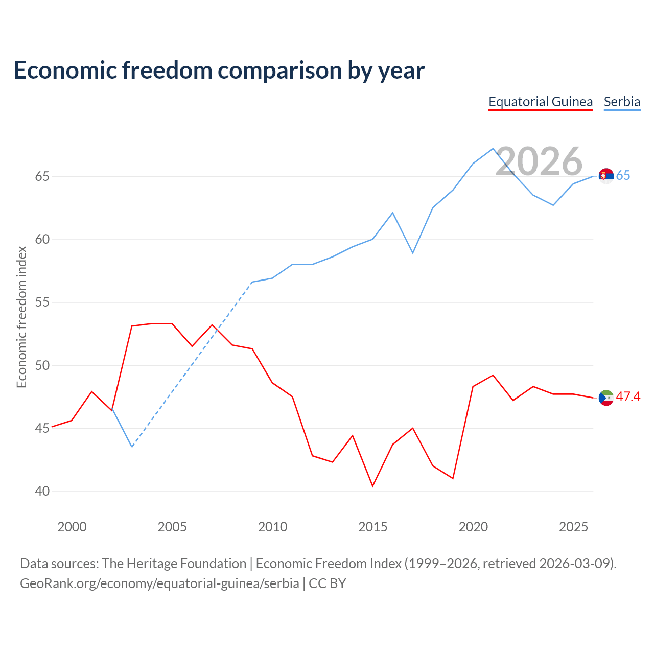 The Economic Freedom Index for Equatorial Guinea is 47.4, ranking 175/197, compared to 65 for Serbia, ranking 68/197. The chart above displays a comparison of annual changes in economic freedom indexes.