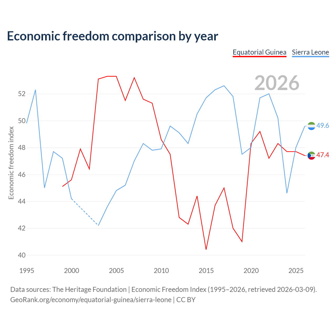 The Economic Freedom Index for Equatorial Guinea is 47.4, ranking 175/197, compared to 49.6 for Sierra Leone, ranking 165/197. The chart above displays a comparison of annual changes in economic freedom indexes.