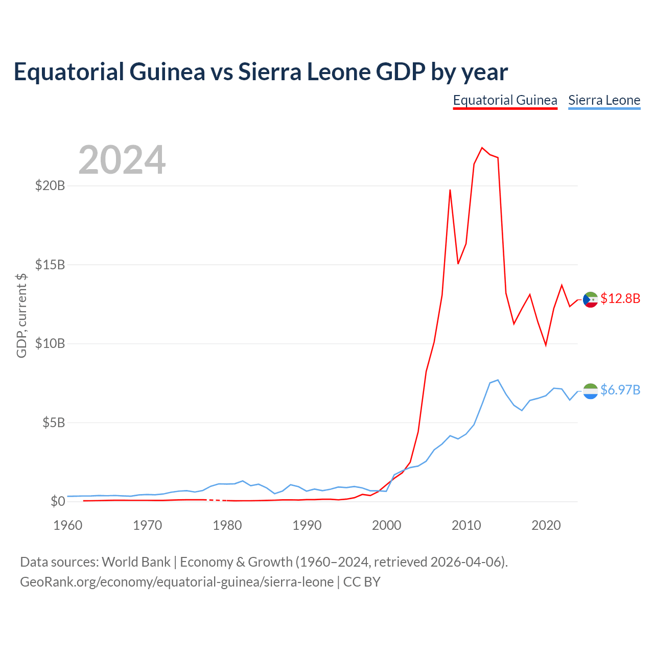 Equatorial Guinea has a GDP of $12.8B compared to $6.97B for Sierra Leone, ranking 148/197 and 160/197 by economy size, respectively.