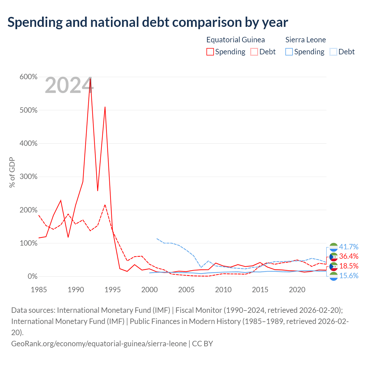 Equatorial Guinea has $4.65B in government debt (36.4% of GDP), compared to $2.91B (41.7% of GDP) in Sierra Leone.