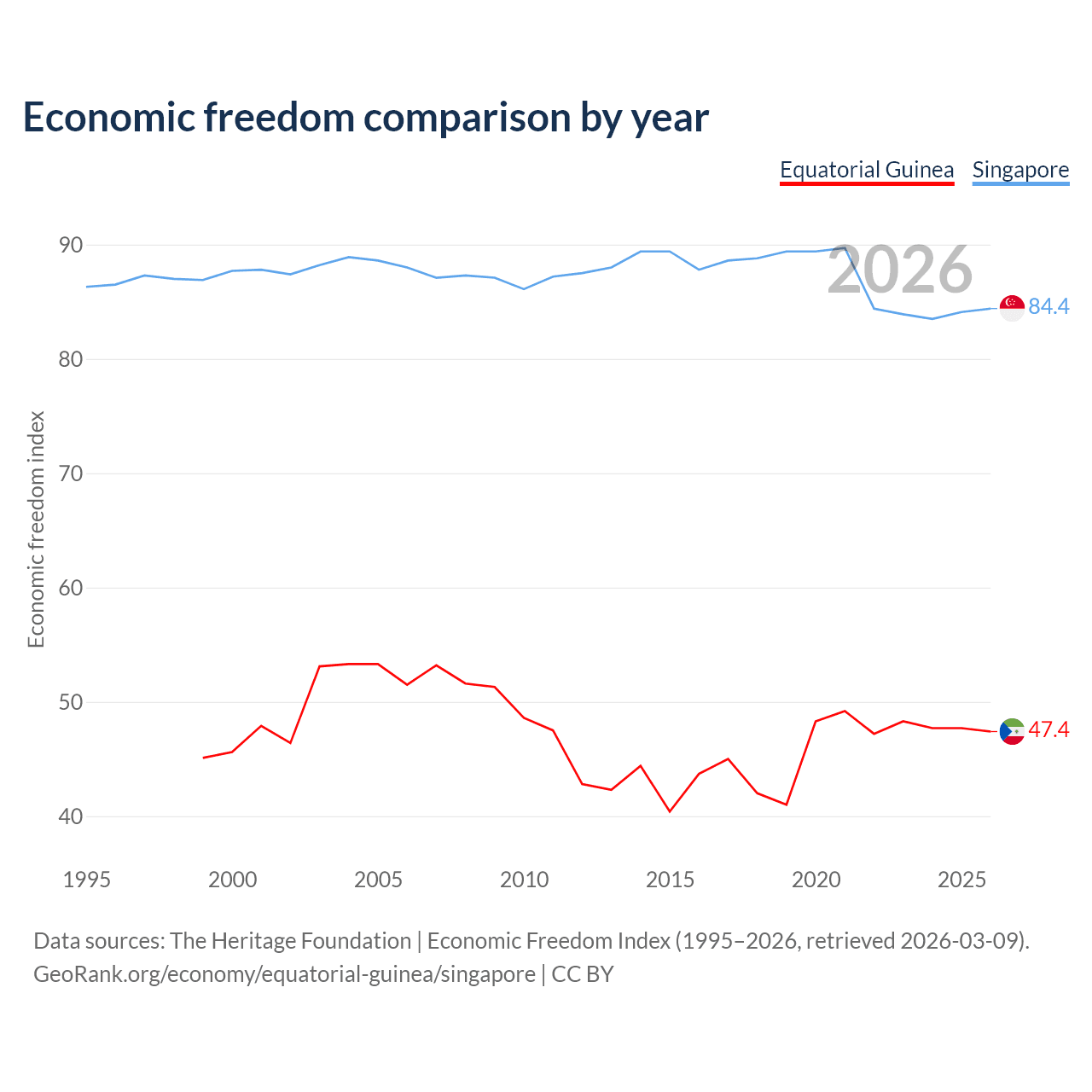 The Economic Freedom Index for Equatorial Guinea is 47.4, ranking 175/197, compared to 84.4 for Singapore, ranking 1/197. The chart above displays a comparison of annual changes in economic freedom indexes.