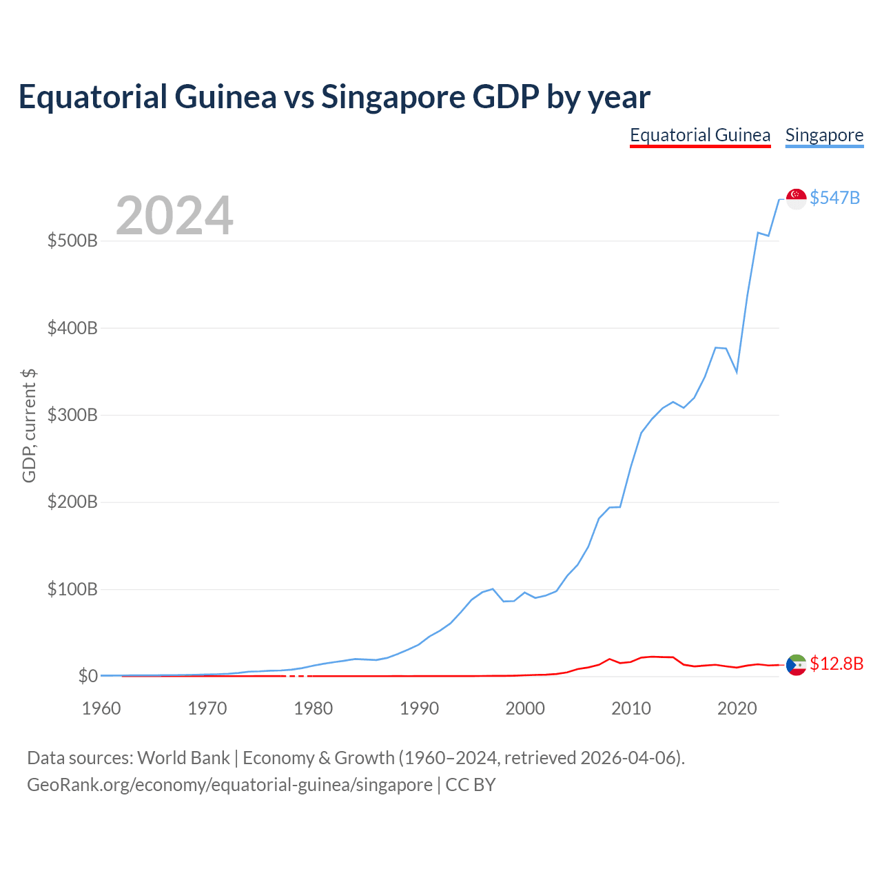 Equatorial Guinea has a GDP of $12.8B compared to $547B for Singapore, ranking 148/197 and 28/197 by economy size, respectively.