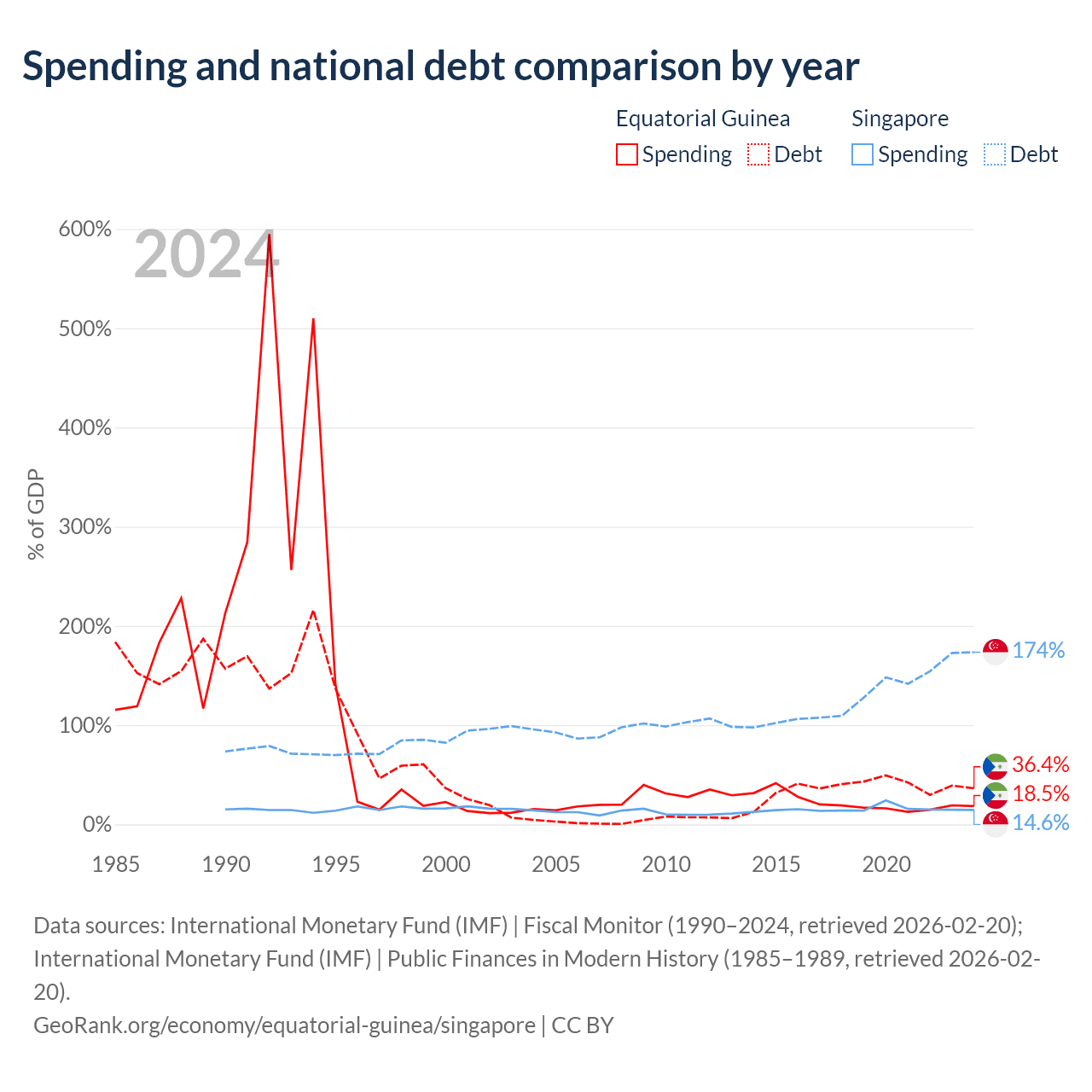 Equatorial Guinea has $4.65B in government debt (36.4% of GDP), compared to $950B (173.5% of GDP) in Singapore.