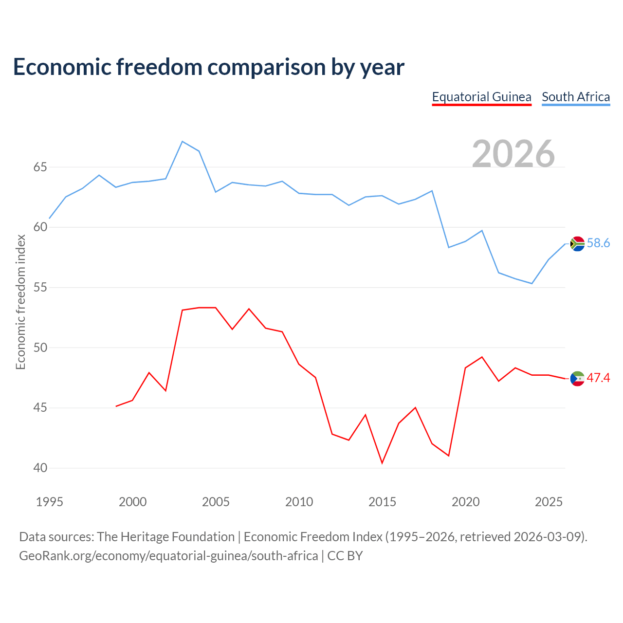 The Economic Freedom Index for Equatorial Guinea is 47.4, ranking 175/197, compared to 58.6 for South Africa, ranking 110/197. The chart above displays a comparison of annual changes in economic freedom indexes.