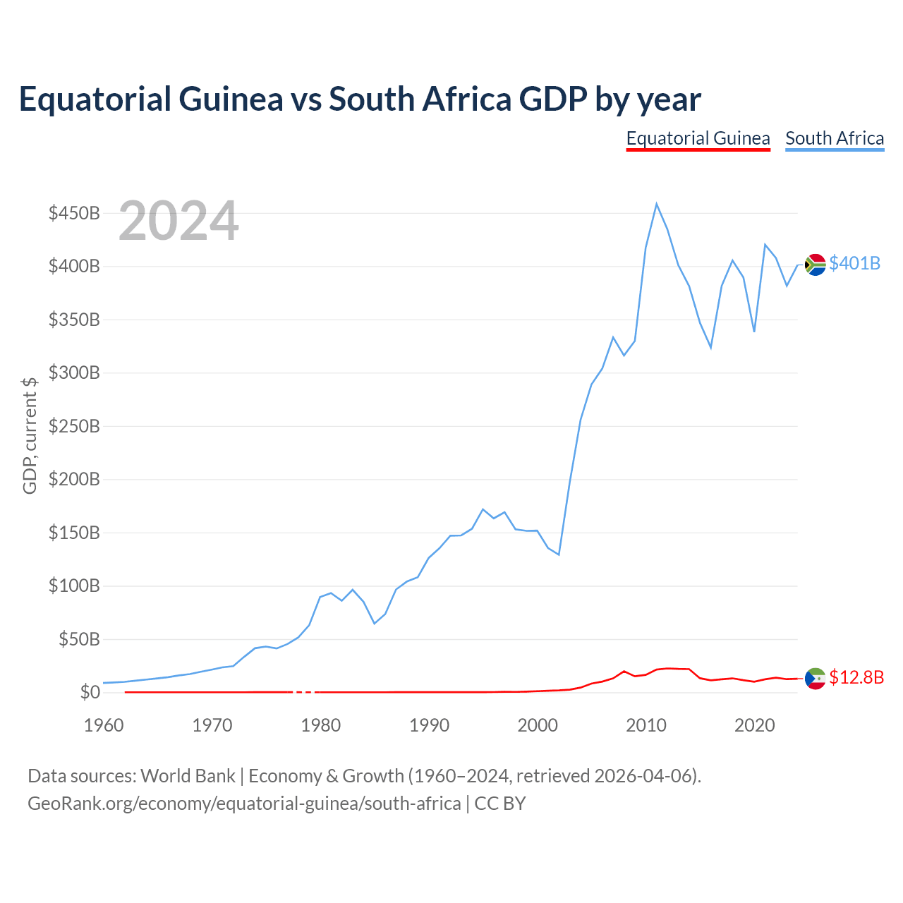 Equatorial Guinea has a GDP of $12.8B compared to $401B for South Africa, ranking 148/197 and 40/197 by economy size, respectively.