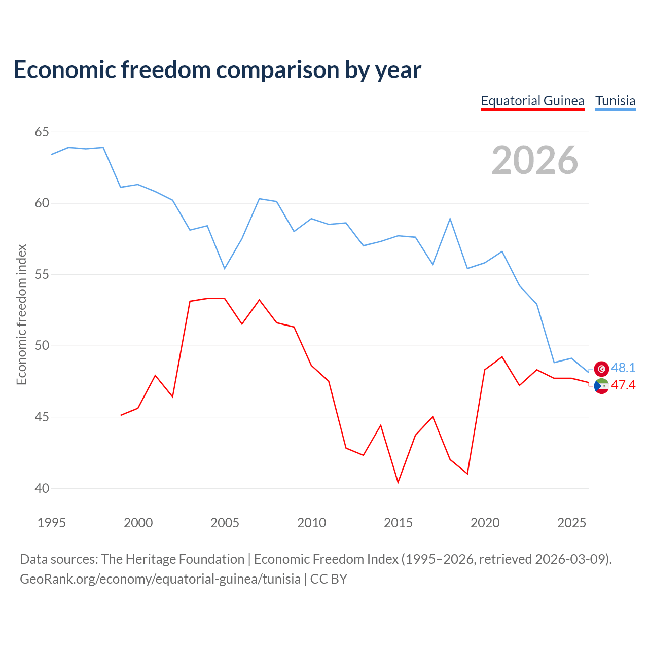Data sources: The Heritage Foundation | Economic Freedom Index (1995–2026, retrieved 2026-03-09).