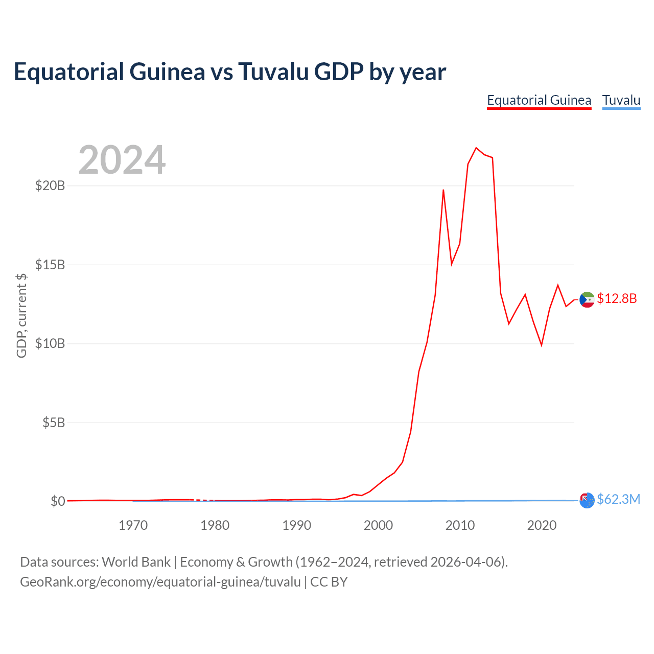 Equatorial Guinea has a GDP of $12.8B compared to $62.3M for Tuvalu, ranking 148/197 and 196/197 by economy size, respectively.