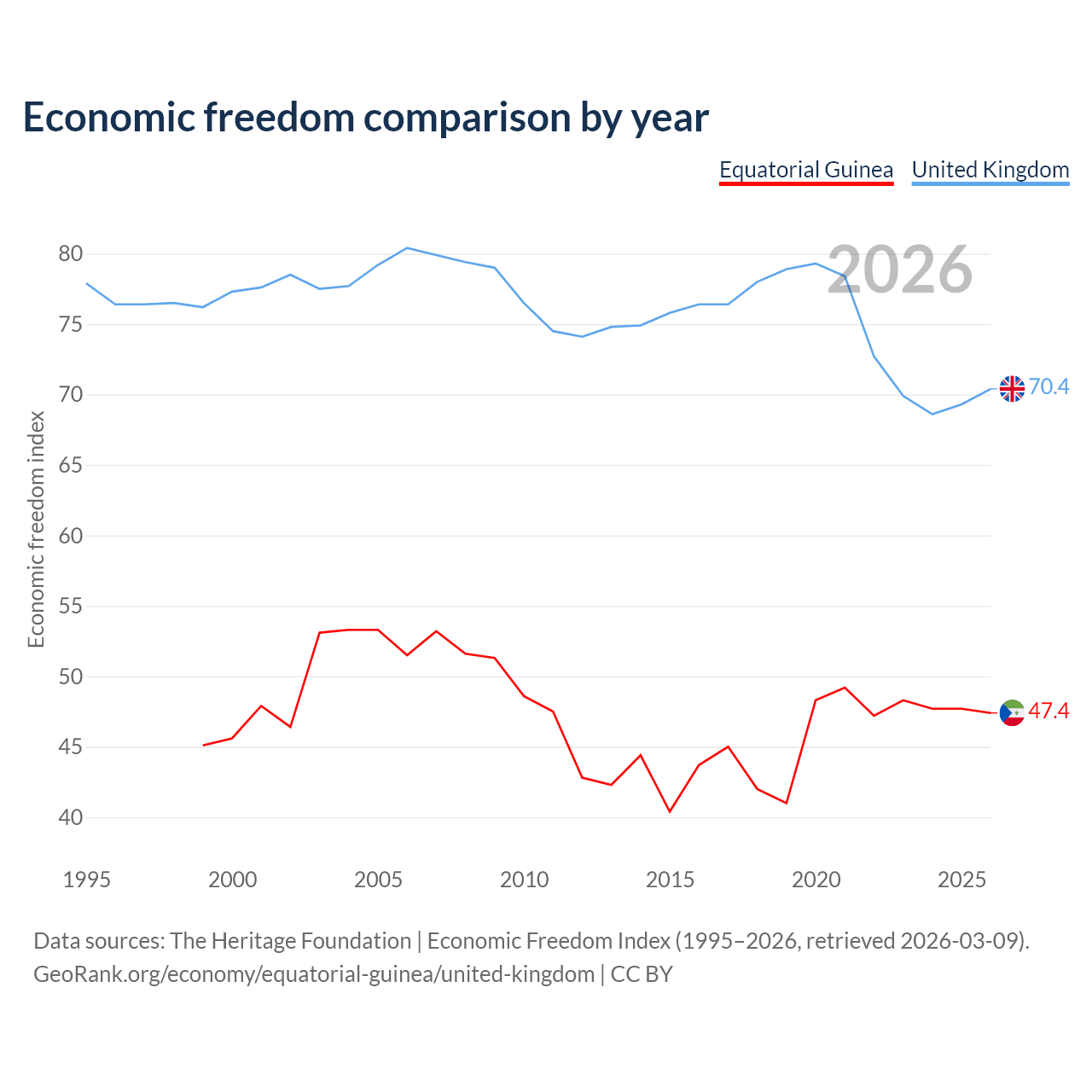 The Economic Freedom Index for Equatorial Guinea is 47.4, ranking 175/197, compared to 70.4 for the United Kingdom, ranking 35/197. The chart above displays a comparison of annual changes in economic freedom indexes.