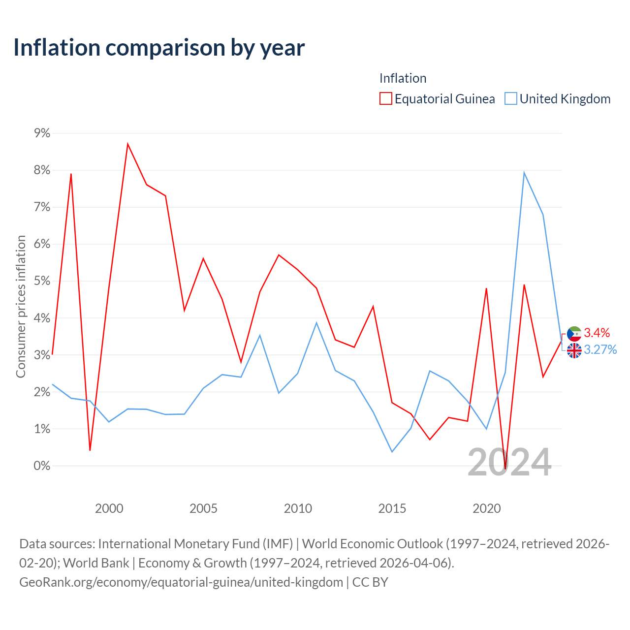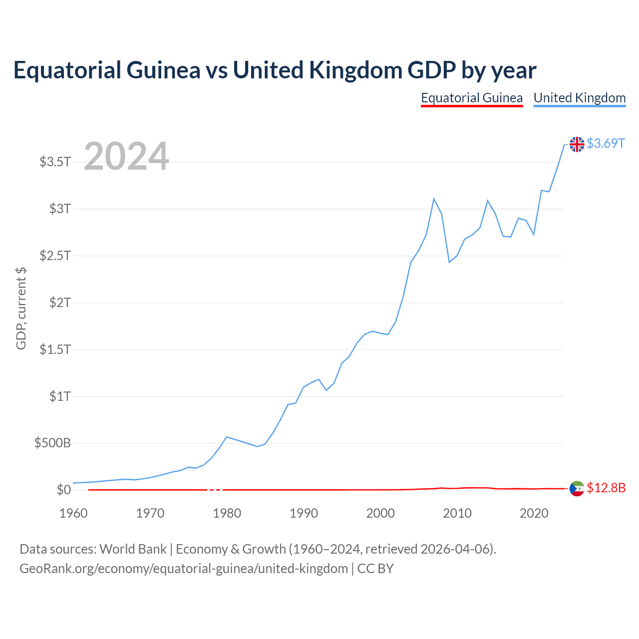 Equatorial Guinea has a GDP of $12.8B compared to $3.69T for the United Kingdom, ranking 148/197 and 6/197 by economy size, respectively.