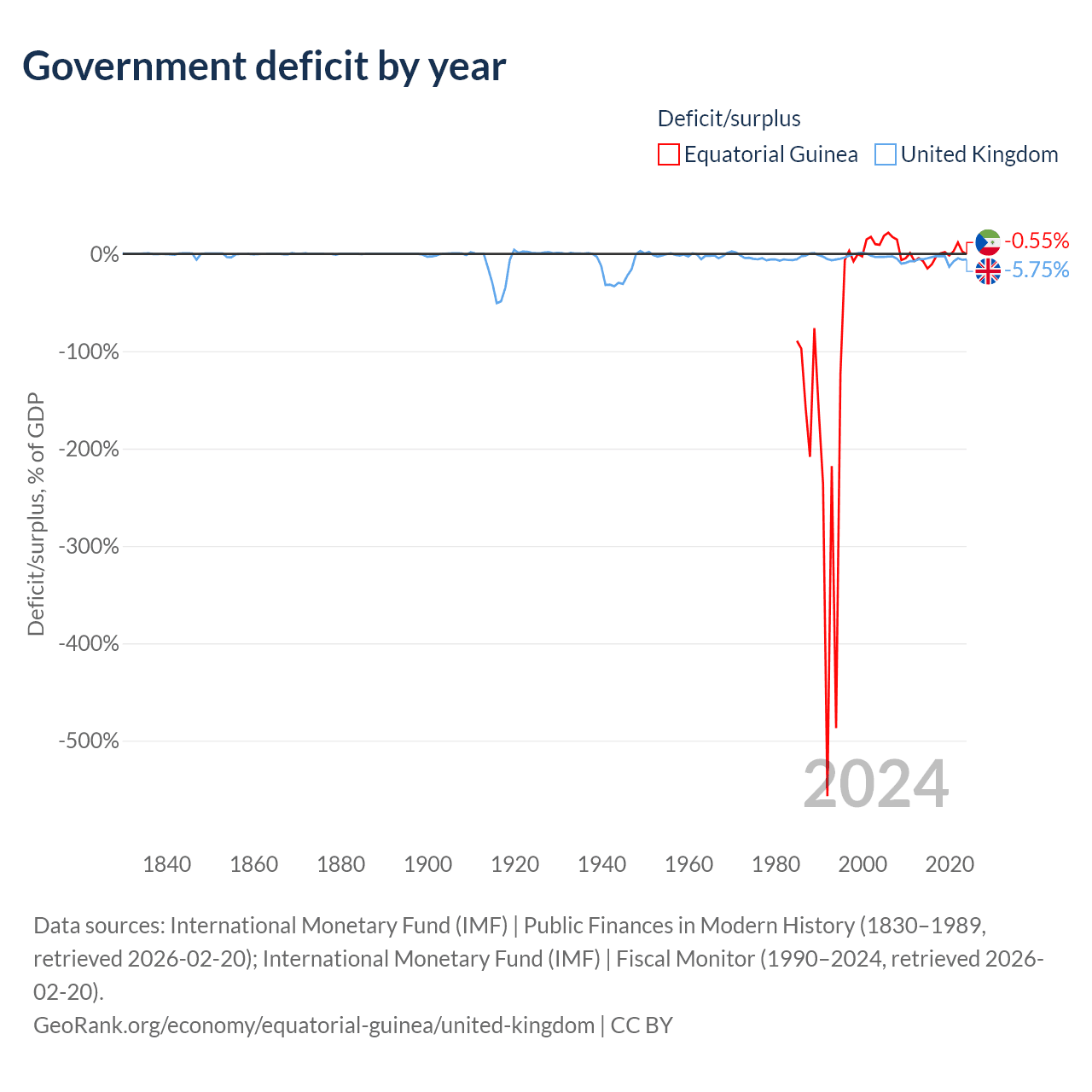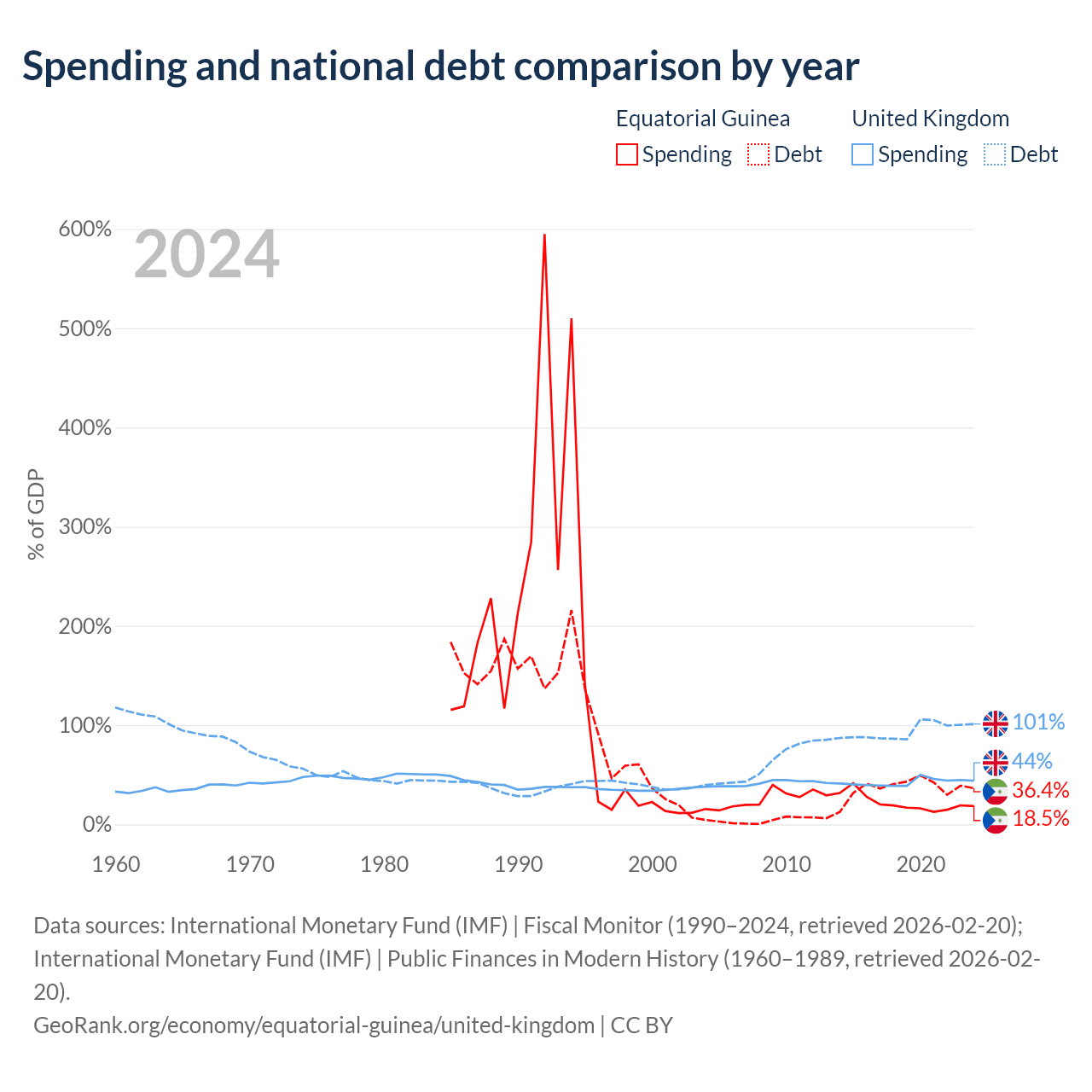 Equatorial Guinea has $4.65B in government debt (36.4% of GDP), compared to $3.73T (101.2% of GDP) in the United Kingdom.