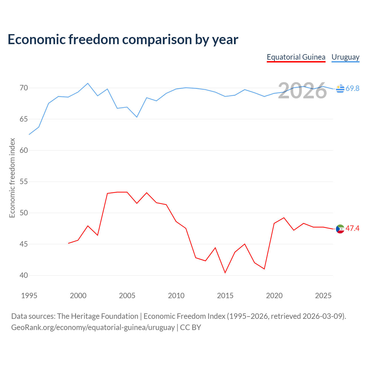 The Economic Freedom Index for Equatorial Guinea is 47.4, ranking 175/197, compared to 69.8 for Uruguay, ranking 39/197. The chart above displays a comparison of annual changes in economic freedom indexes.