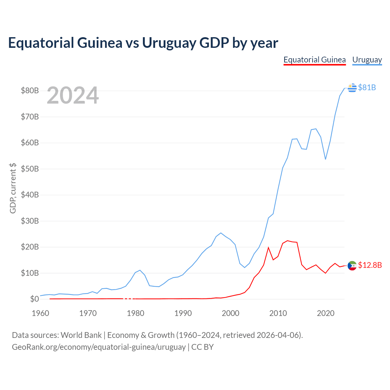 Equatorial Guinea has a GDP of $12.8B compared to $81B for Uruguay, ranking 148/197 and 81/197 by economy size, respectively.