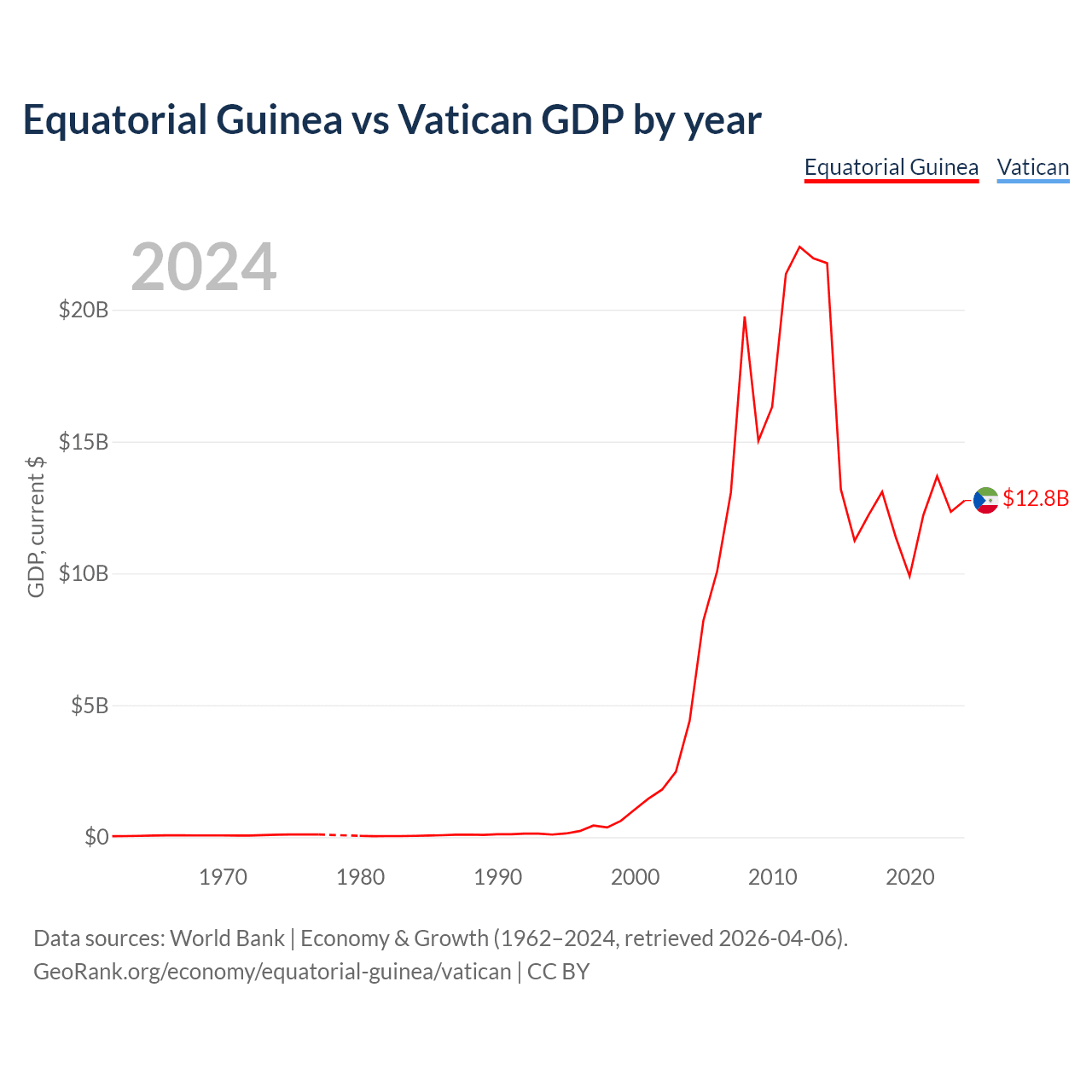 Equatorial Guinea has a GDP of $12.8B compared to $19.8M for the Vatican, ranking 148/197 and 197/197 by economy size, respectively.