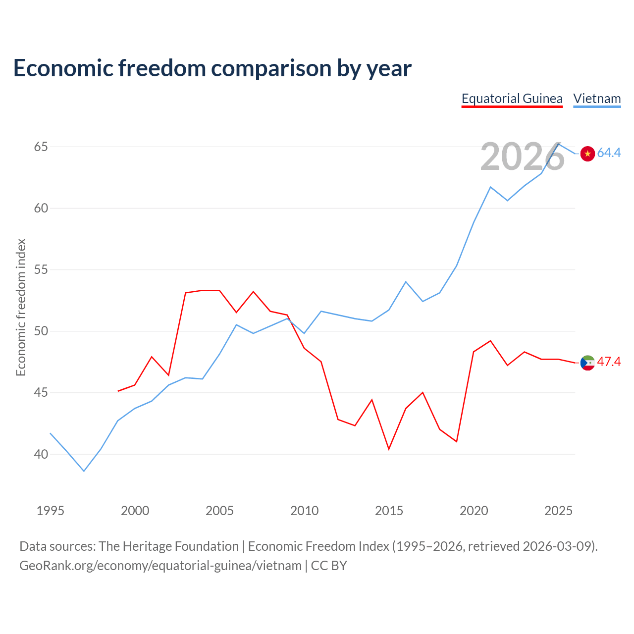 The Economic Freedom Index for Equatorial Guinea is 47.4, ranking 175/197, compared to 64.4 for Vietnam, ranking 73/197. The chart above displays a comparison of annual changes in economic freedom indexes.