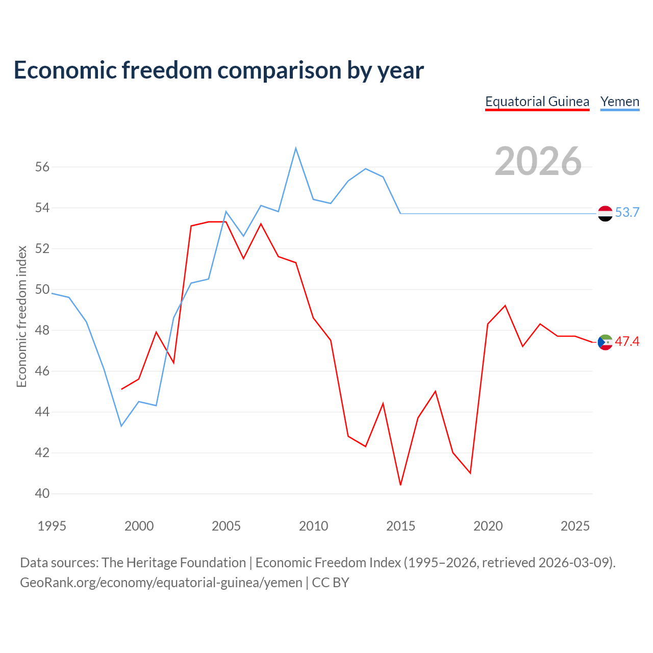 The Economic Freedom Index for Equatorial Guinea is 47.4, ranking 175/197, compared to 53.7 for Yemen, ranking 138/197. The chart above displays a comparison of annual changes in economic freedom indexes.
