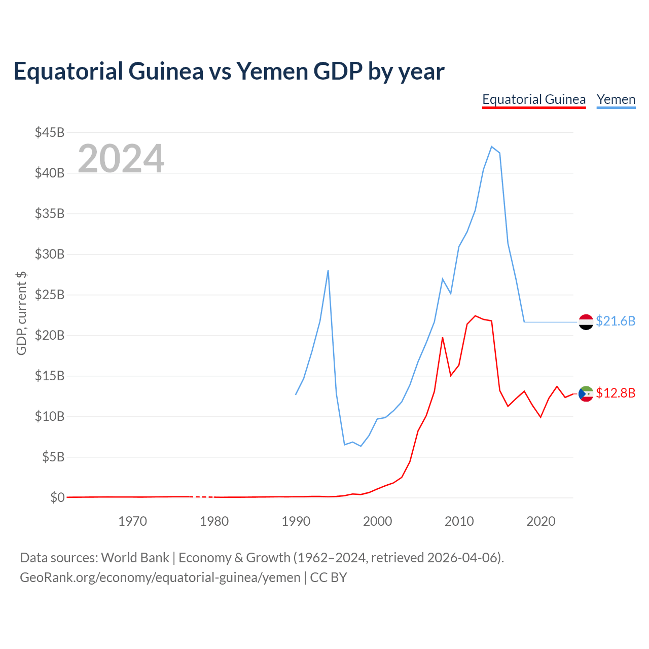 Equatorial Guinea has a GDP of $12.8B compared to $21.6B for Yemen, ranking 148/197 and 125/197 by economy size, respectively.