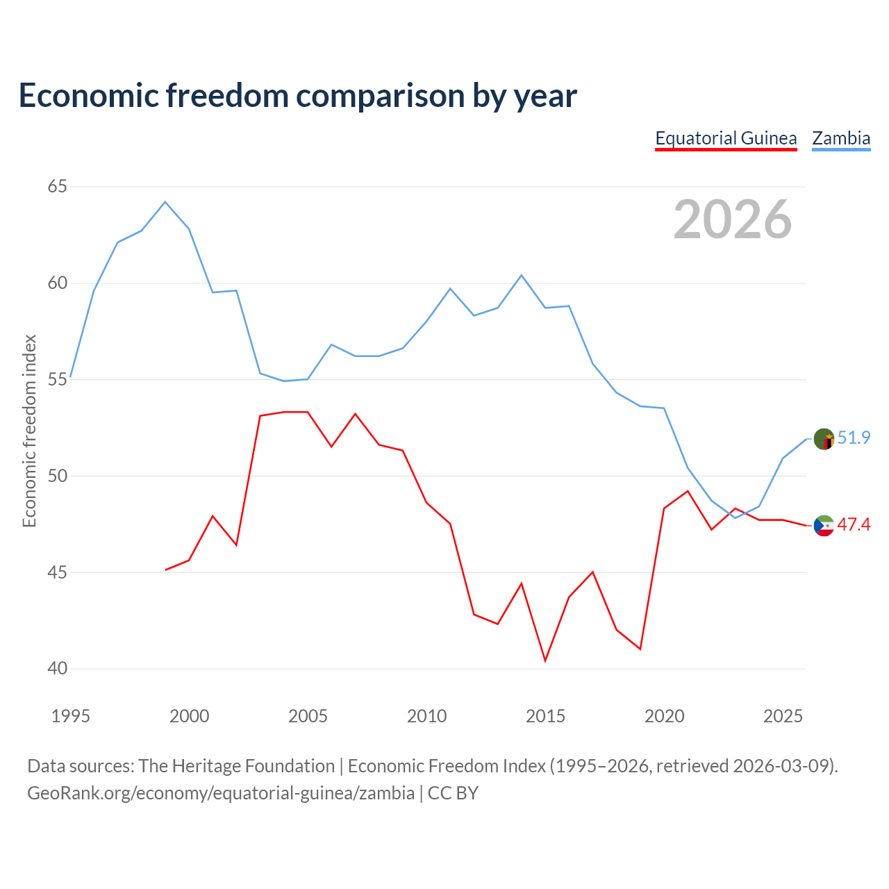The Economic Freedom Index for Equatorial Guinea is 47.4, ranking 175/197, compared to 51.9 for Zambia, ranking 152/197. The chart above displays a comparison of annual changes in economic freedom indexes.