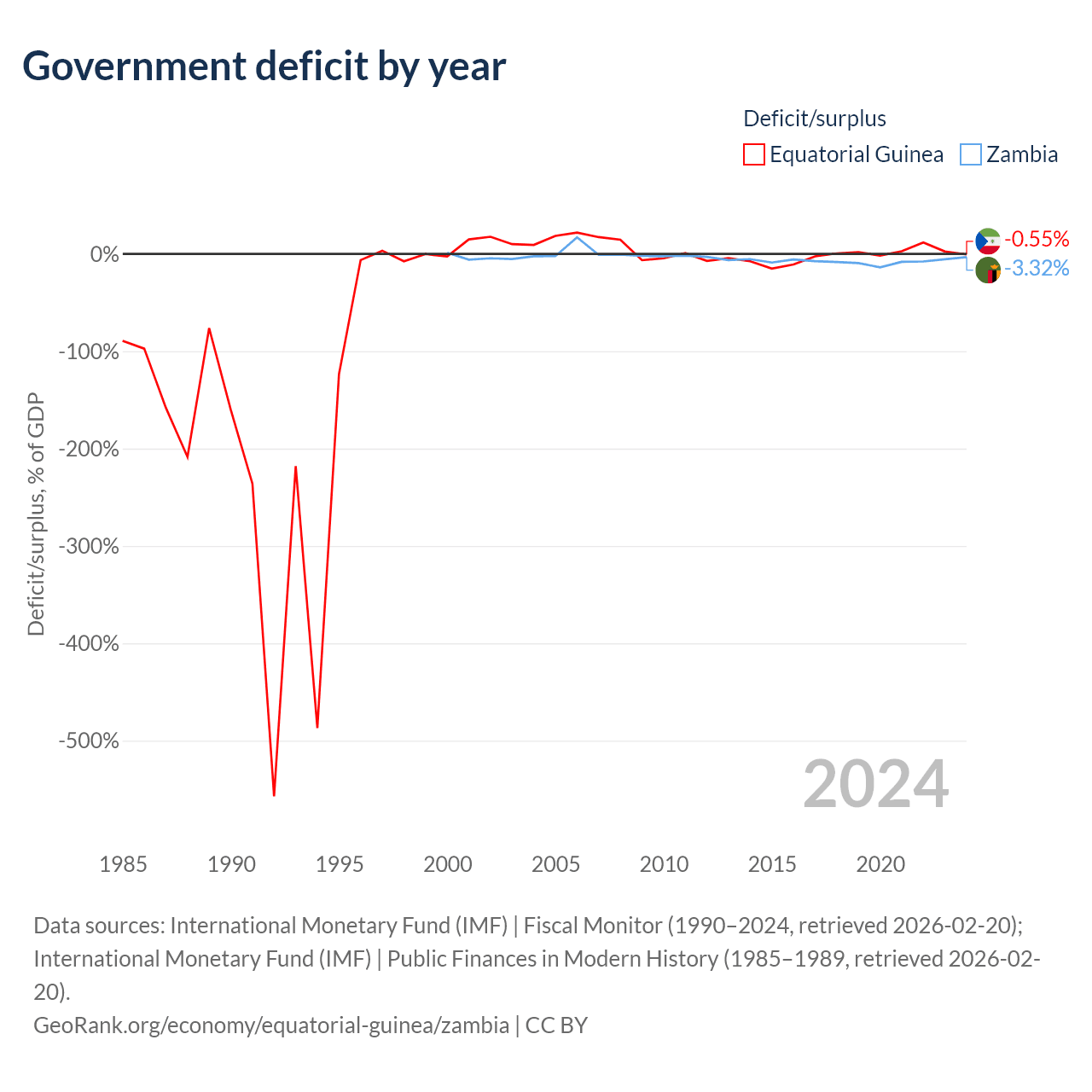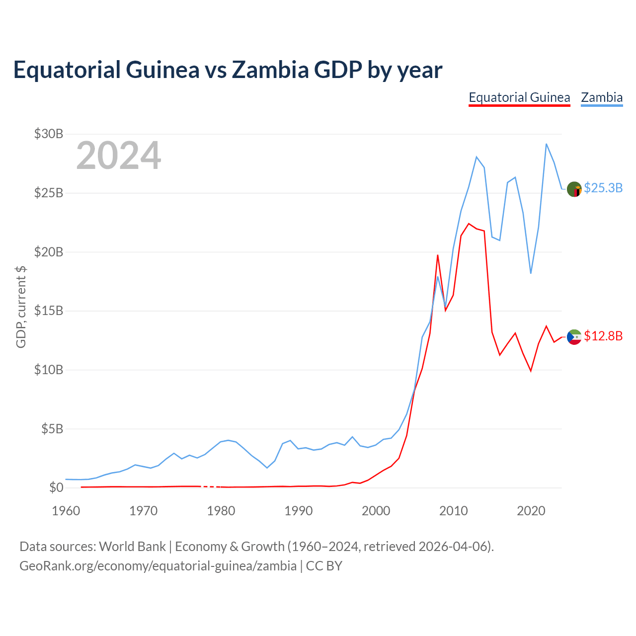 Equatorial Guinea has a GDP of $12.8B compared to $25.3B for Zambia, ranking 148/197 and 116/197 by economy size, respectively.