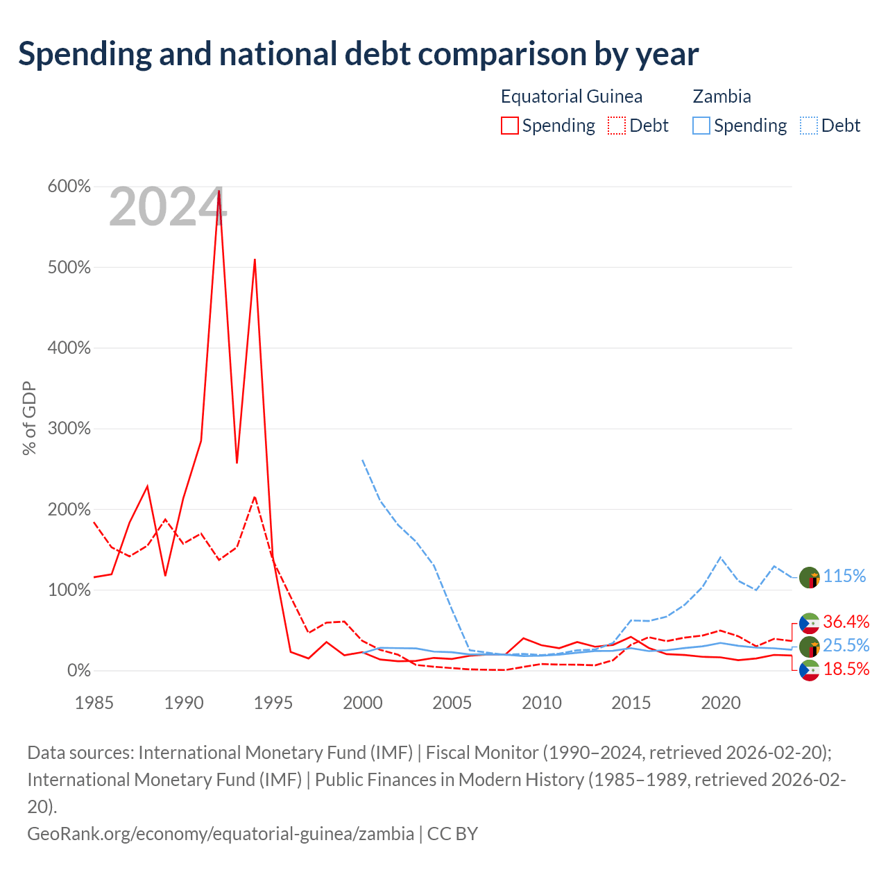Equatorial Guinea has $4.65B in government debt (36.4% of GDP), compared to $29.1B (114.9% of GDP) in Zambia.