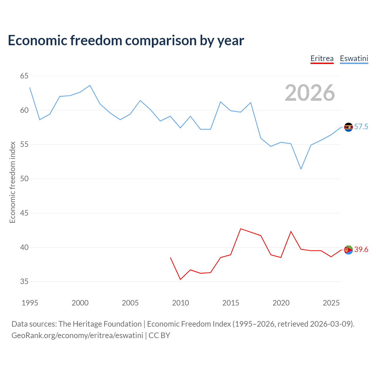 The Economic Freedom Index for Eritrea is 39.6, ranking 188/197, compared to 57.5 for Eswatini, ranking 116/197. The chart above displays a comparison of annual changes in economic freedom indexes.