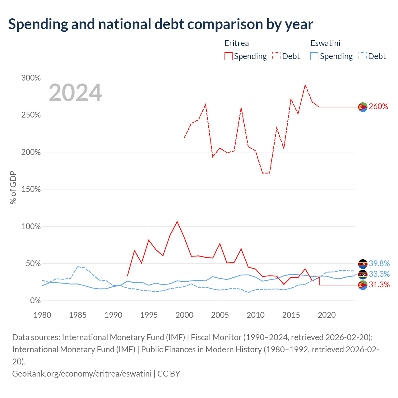 Eritrea has $3.54B in government debt (260.4% of GDP), compared to $1.93B (39.8% of GDP) in Eswatini.