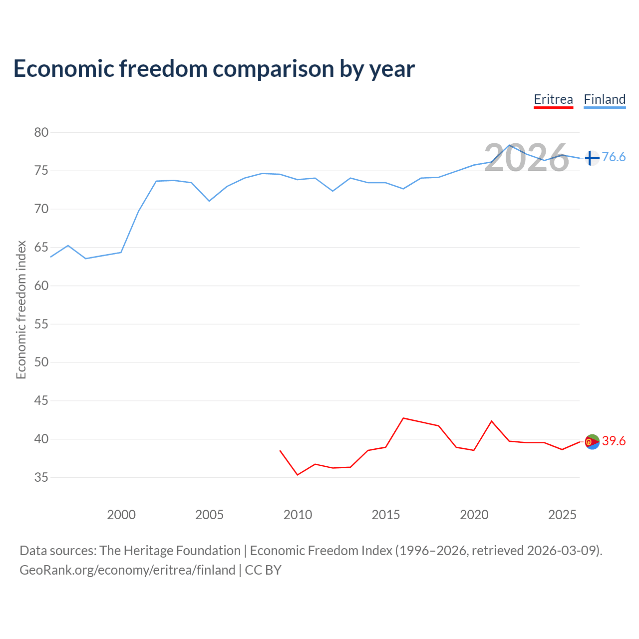 The Economic Freedom Index for Eritrea is 39.6, ranking 188/197, compared to 76.6 for Finland, ranking 15/197. The chart above displays a comparison of annual changes in economic freedom indexes.