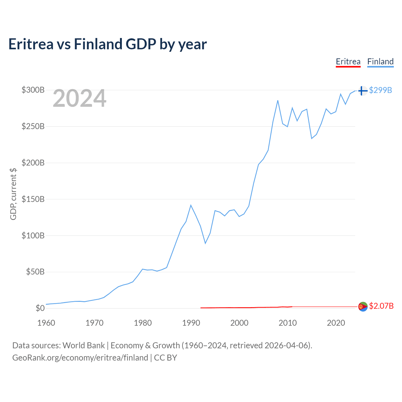 Eritrea has a GDP of $2.07B compared to $299B for Finland, ranking 179/197 and 47/197 by economy size, respectively.