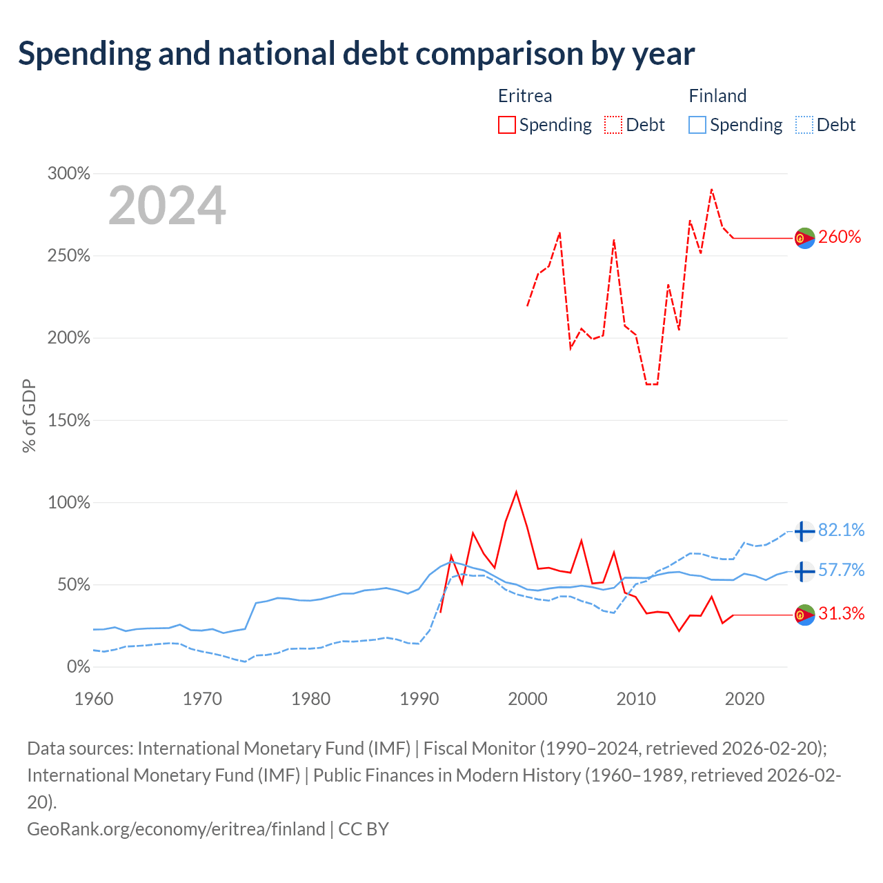 Eritrea has $3.54B in government debt (260.4% of GDP), compared to $245B (82.1% of GDP) in Finland.