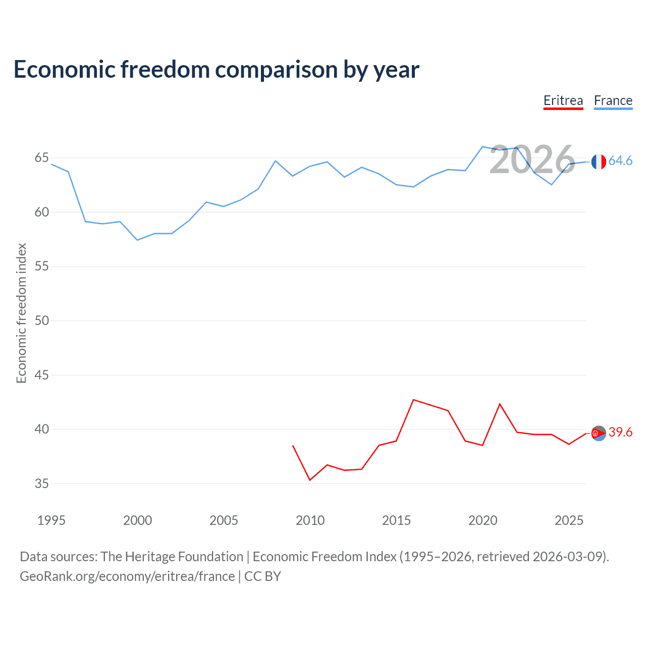 The Economic Freedom Index for Eritrea is 39.6, ranking 188/197, compared to 64.6 for France, ranking 72/197. The chart above displays a comparison of annual changes in economic freedom indexes.