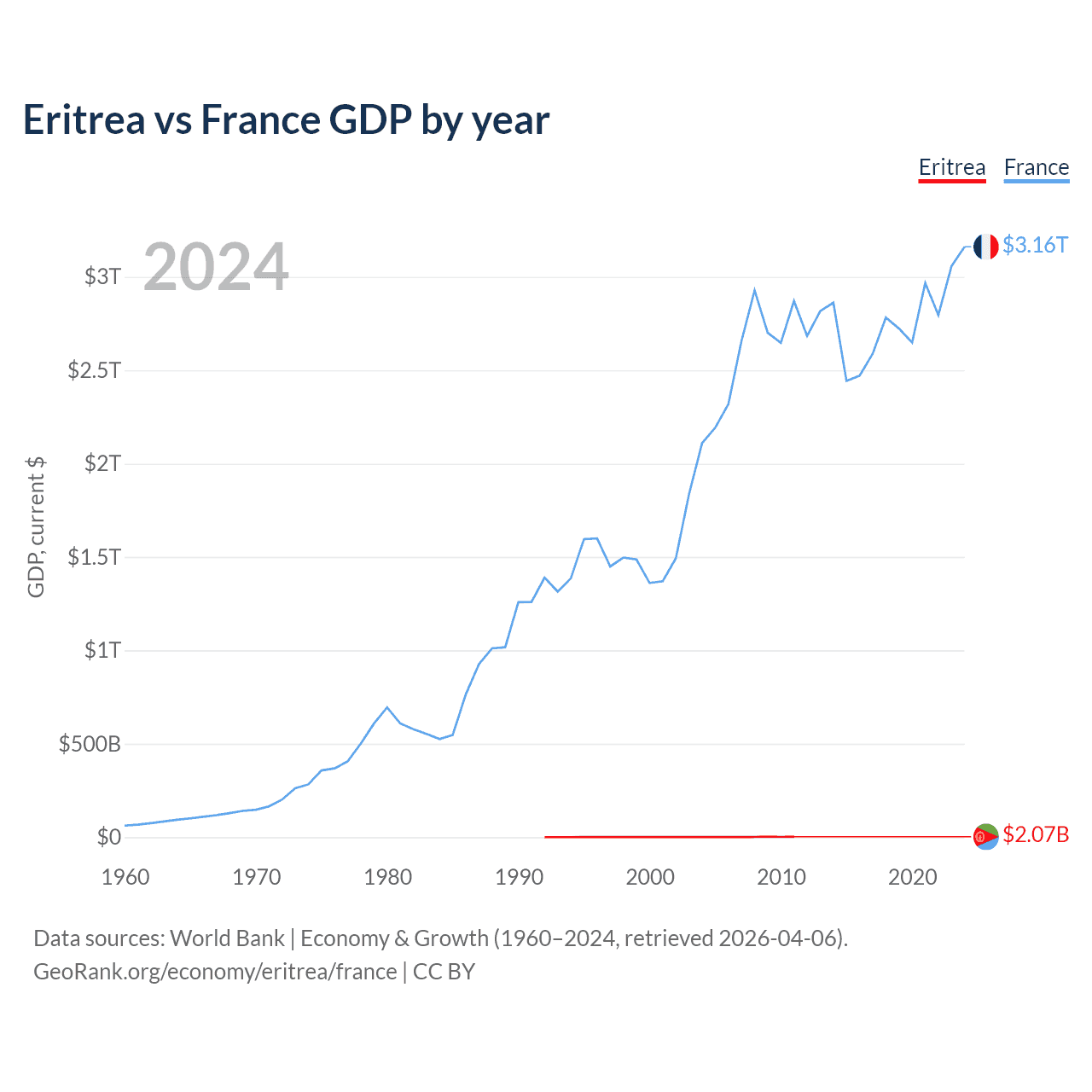 Eritrea has a GDP of $2.07B compared to $3.16T for France, ranking 179/197 and 7/197 by economy size, respectively.