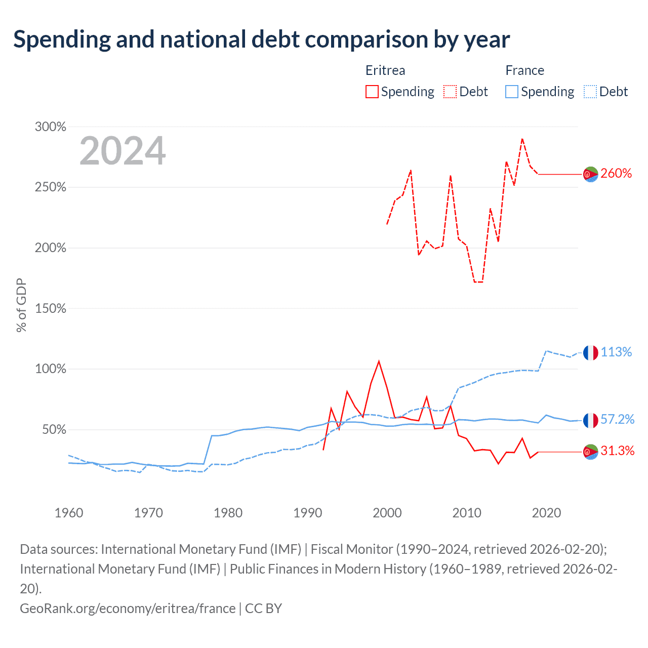 Eritrea has $3.54B in government debt (260.4% of GDP), compared to $3.58T (113.1% of GDP) in France.