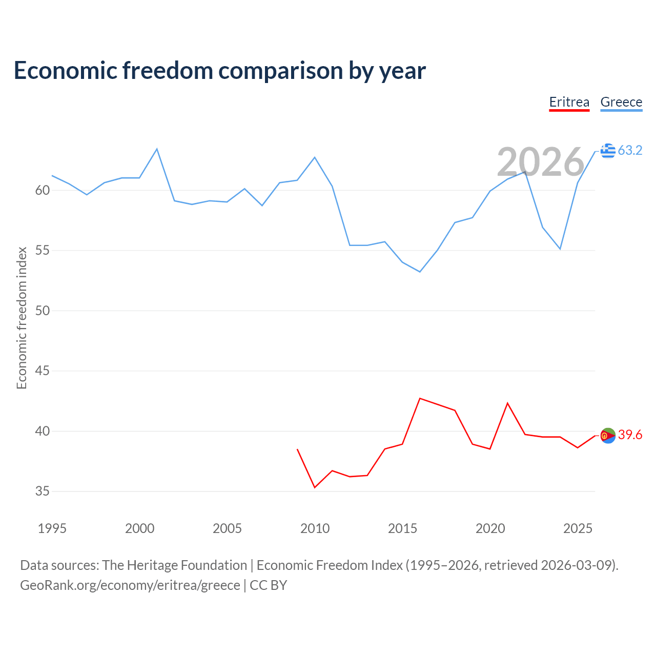 The Economic Freedom Index for Eritrea is 39.6, ranking 188/197, compared to 63.2 for Greece, ranking 82/197. The chart above displays a comparison of annual changes in economic freedom indexes.