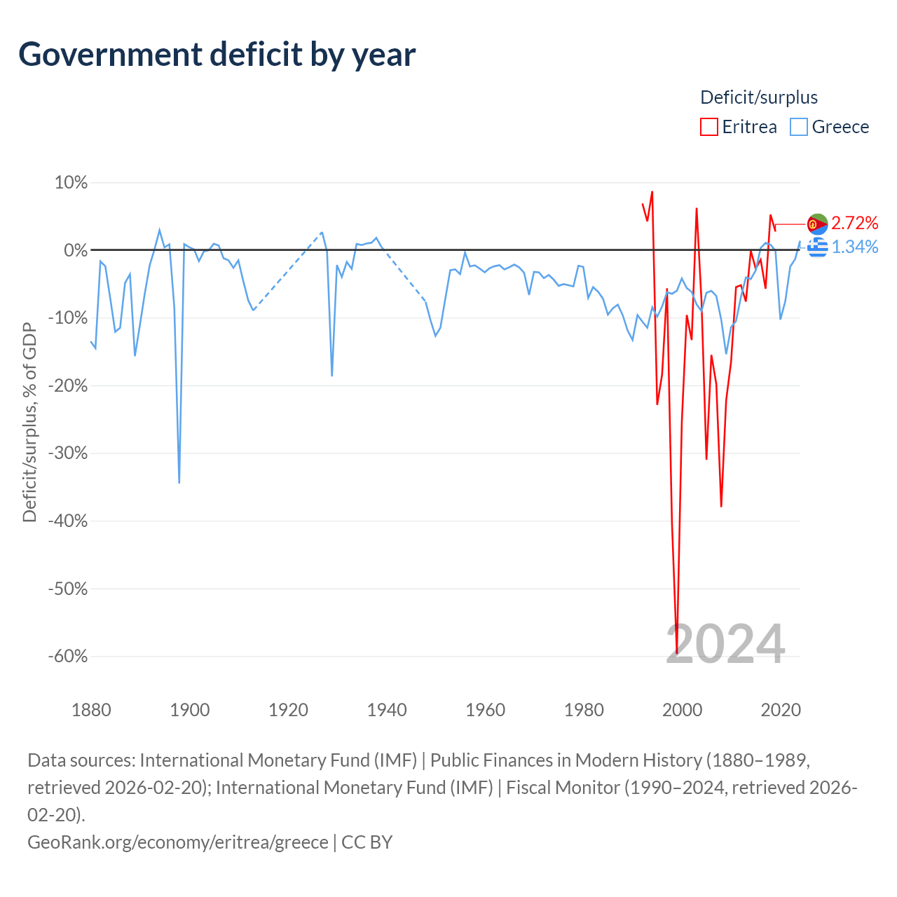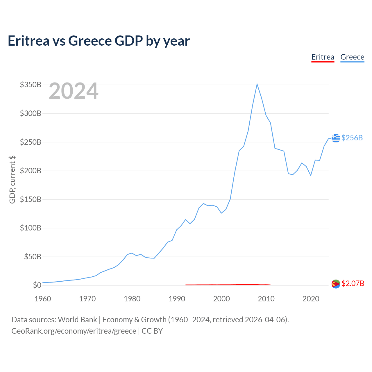 Eritrea has a GDP of $2.07B compared to $256B for Greece, ranking 179/197 and 53/197 by economy size, respectively.