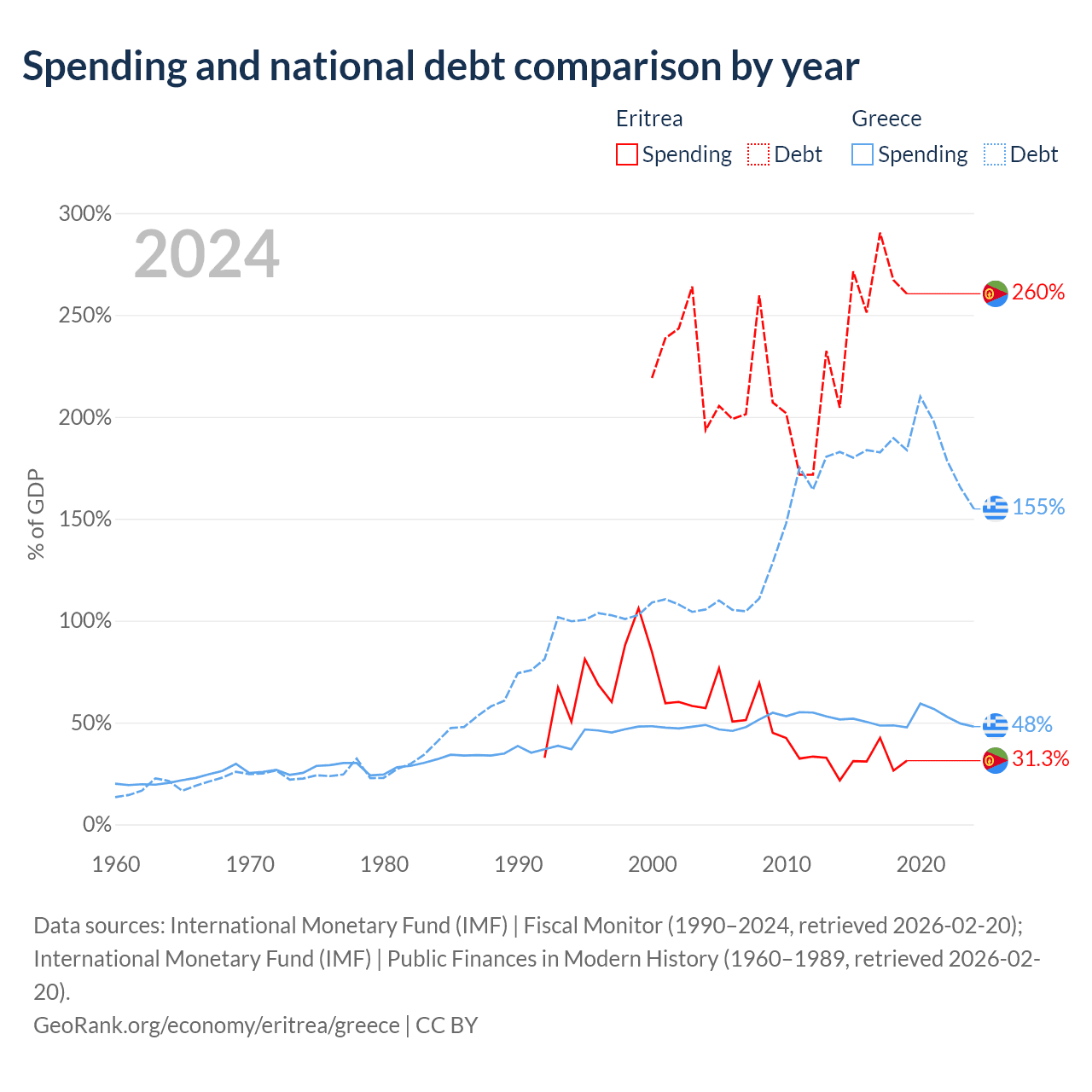 Eritrea has $3.54B in government debt (260.4% of GDP), compared to $397B (154.8% of GDP) in Greece.