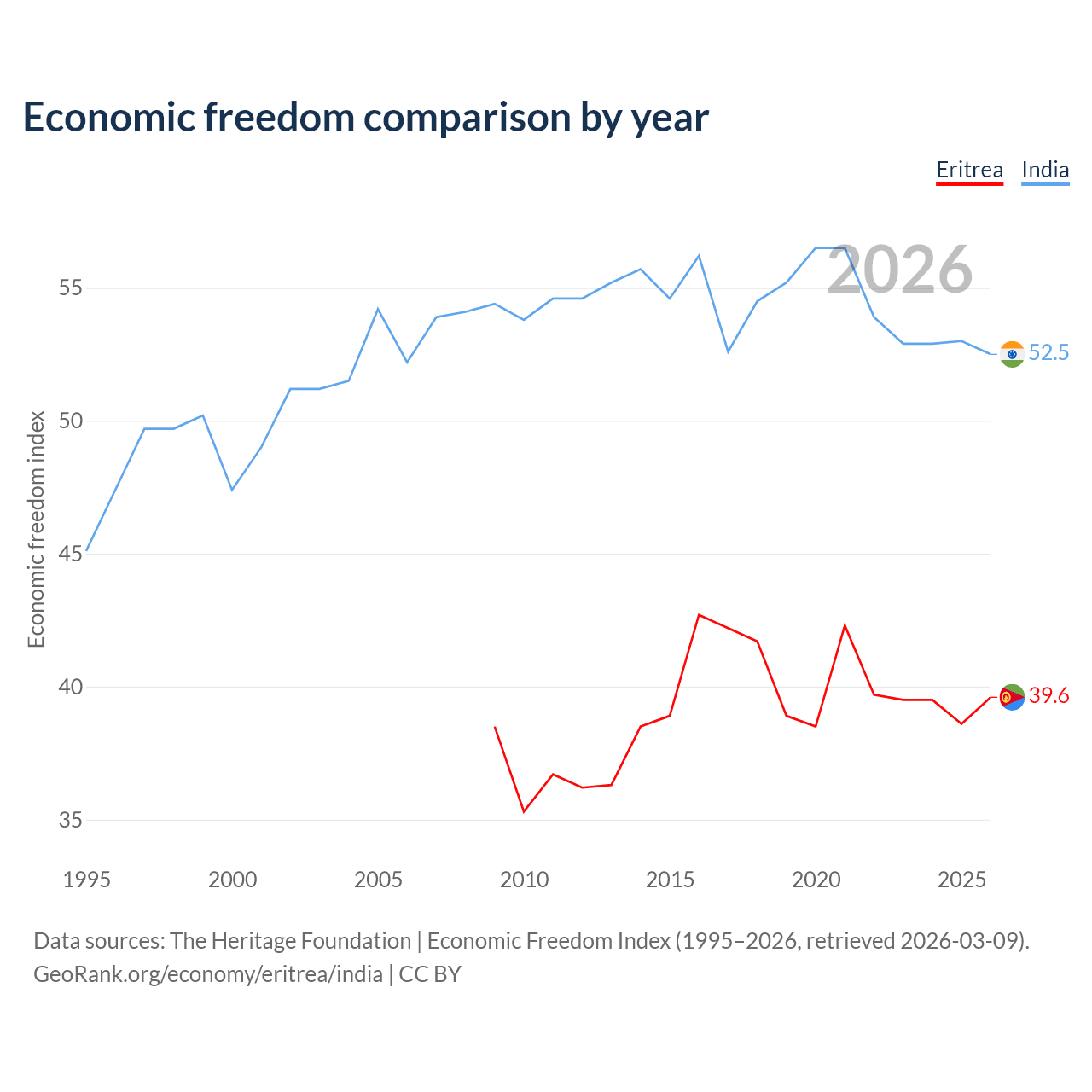 The Economic Freedom Index for Eritrea is 39.6, ranking 188/197, compared to 52.5 for India, ranking 146/197. The chart above displays a comparison of annual changes in economic freedom indexes.
