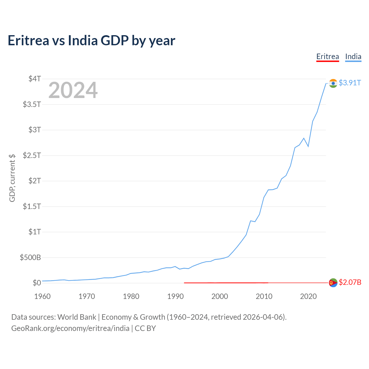 Eritrea has a GDP of $2.07B compared to $3.91T for India, ranking 179/197 and 5/197 by economy size, respectively.