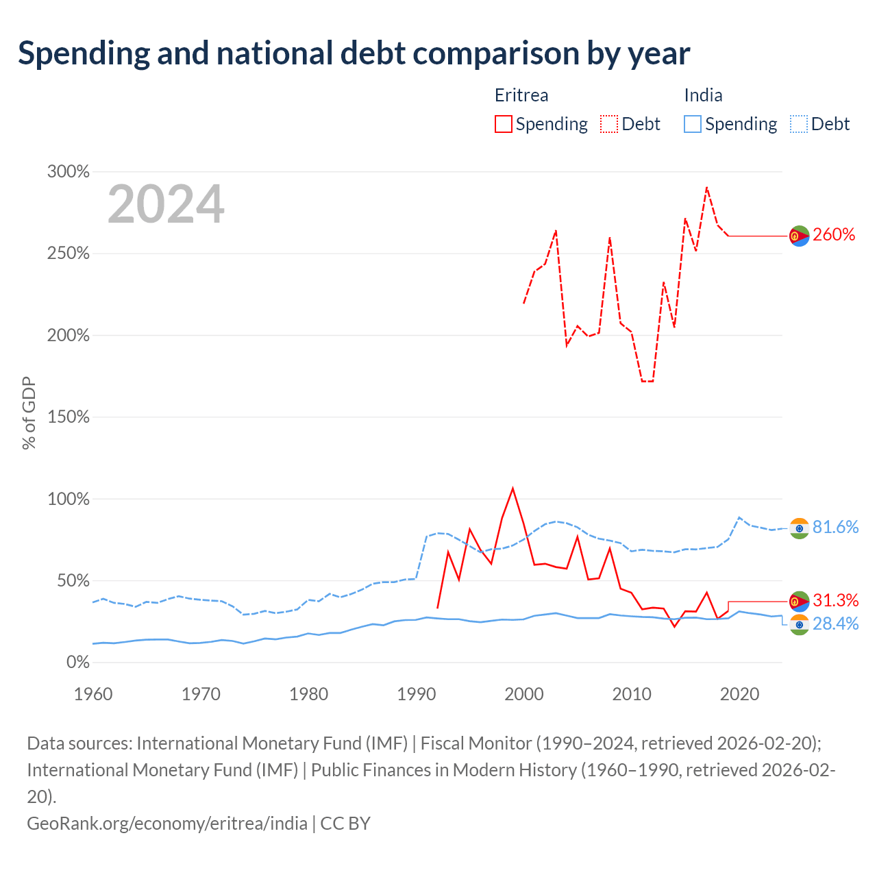 Eritrea has $3.54B in government debt (260.4% of GDP), compared to $3.19T (81.6% of GDP) in India.