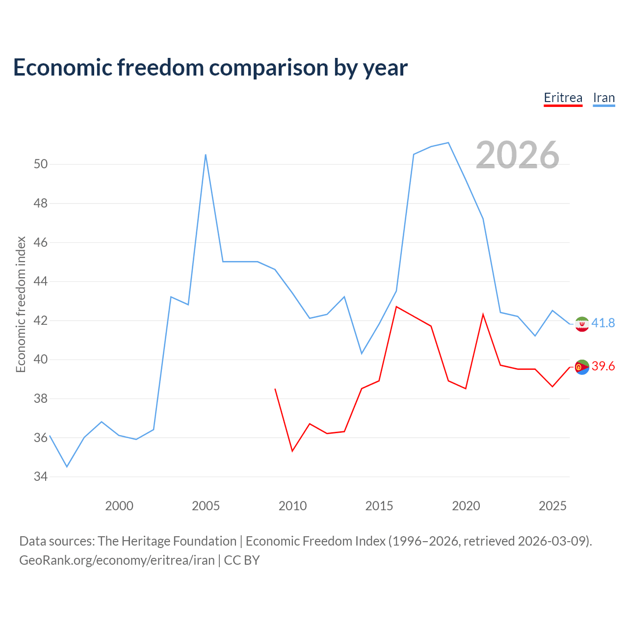 The Economic Freedom Index for Eritrea is 39.6, ranking 188/197, compared to 41.8 for Iran, ranking 185/197. The chart above displays a comparison of annual changes in economic freedom indexes.
