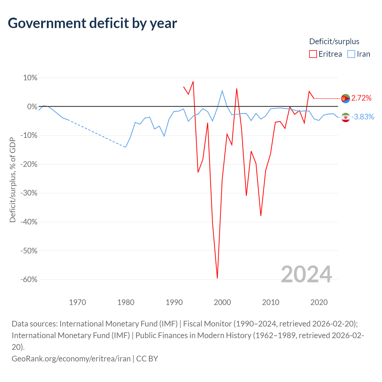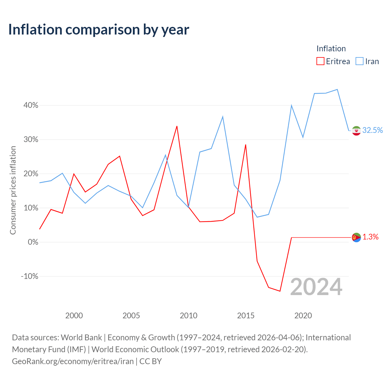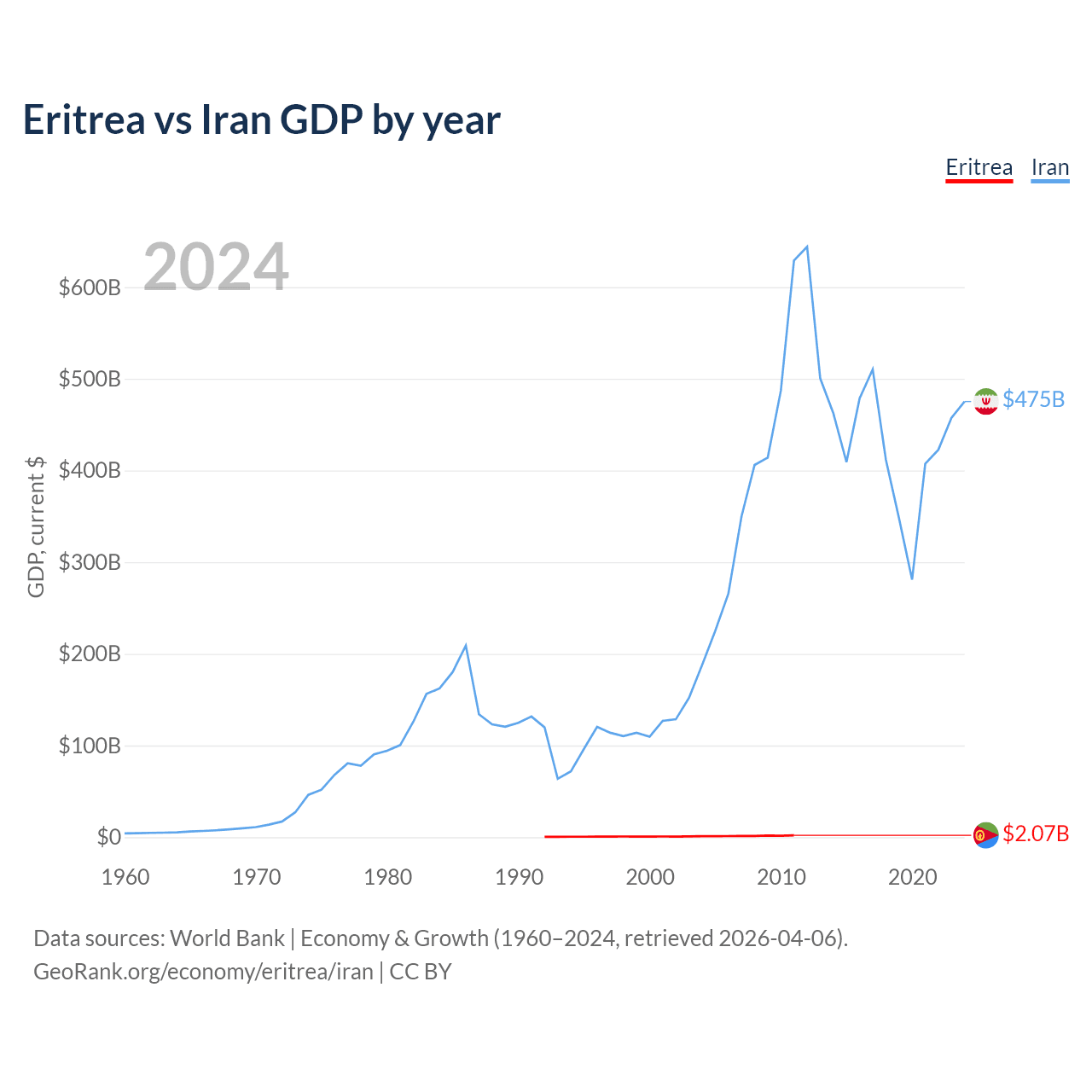 Eritrea has a GDP of $2.07B compared to $475B for Iran, ranking 179/197 and 34/197 by economy size, respectively.