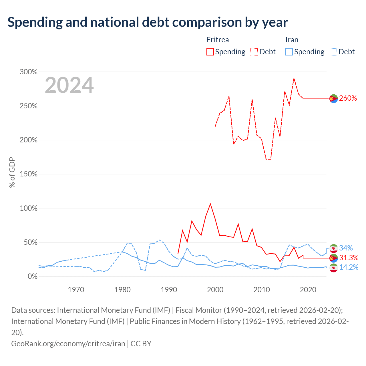 Eritrea has $3.54B in government debt (260.4% of GDP), compared to $162B (34% of GDP) in Iran.