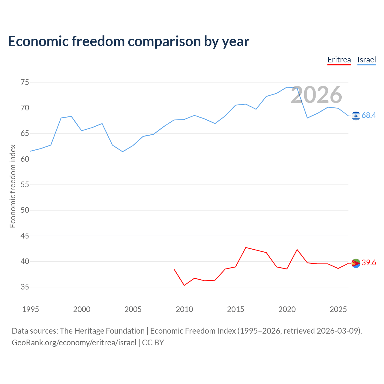 The Economic Freedom Index for Eritrea is 39.6, ranking 188/197, compared to 68.4 for Israel, ranking 47/197. The chart above displays a comparison of annual changes in economic freedom indexes.