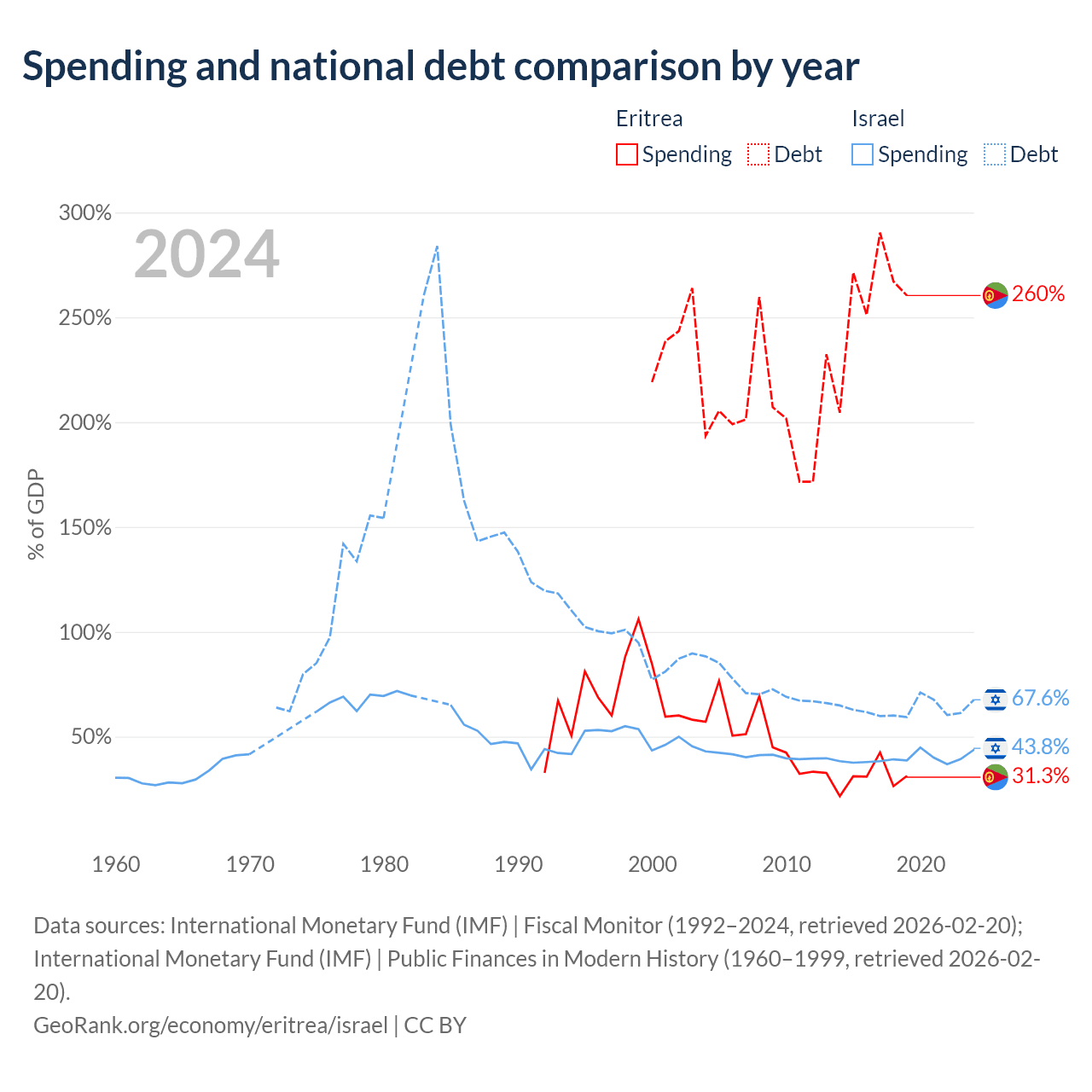 Eritrea has $3.54B in government debt (260.4% of GDP), compared to $366B (67.6% of GDP) in Israel.