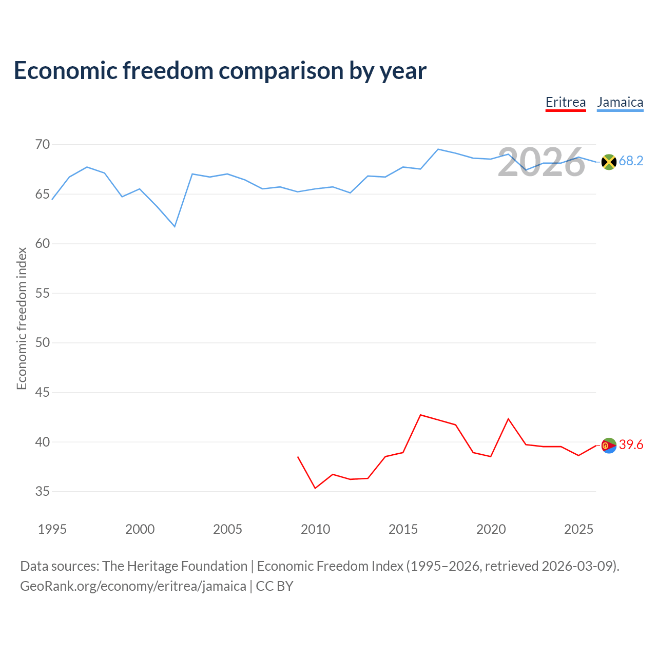 The Economic Freedom Index for Eritrea is 39.6, ranking 188/197, compared to 68.2 for Jamaica, ranking 48/197. The chart above displays a comparison of annual changes in economic freedom indexes.